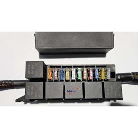 Porta relè e fusibili progettato per ospitare fino a 6 mini relè e 11 fusibili Unival, completo di coperchio protettivo e cablaggio preinstallato.
